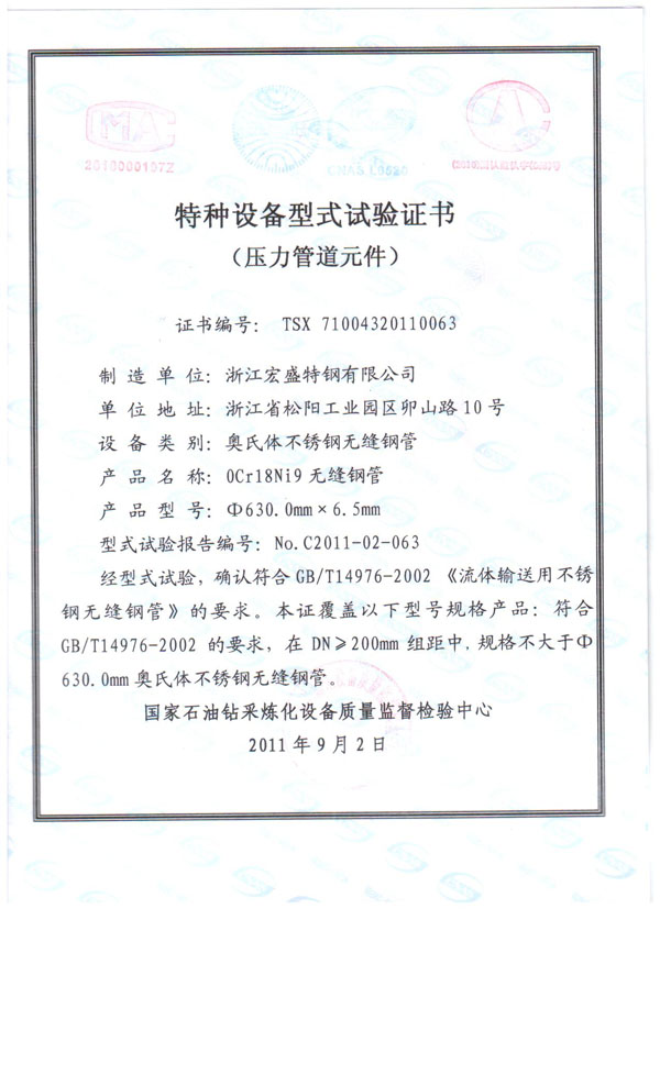 我們公司制造 牌號:0Cr18Ni9 規格:630mm×6.5mm 的大口徑薄壁不銹鋼管(無縫),通過國家石油鉆采煉化設備質量監督檢驗中心的特種設備形式試驗,證書編號:TSX 71004320110063 代表著我們在大口徑薄壁不銹鋼管(無縫)的制造技術在國內處于領先的水準。目前也是浙江地區唯一可生產此類規格大口徑薄壁不銹鋼管(無縫)廠家。